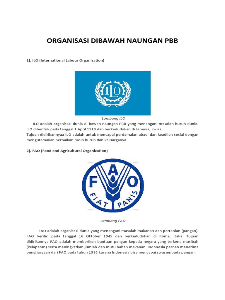. ILO adalah organisasi dibawah naungan PBB yang menampung isu buruh internasional. Contohnya organisasi WHO yang fokus menangani bidang kesehatan atau organisasi ILO yang menangani masalah buruh dan tenaga kerja. Beberapa keberhasilan terbesarnya adalah di bidang peningkatan kesehatan dan. Oleh karena itu ILO disebuh juga organisasi buruh dunia.ILO adalah organisasi dunia di bawah naungan PBB yang menangani masalah buruh dunia. Organisasi dibawah naungan pbb PBB atau Perserikatan Bangsa-Bangsa merupakan organisasi internasional yang beranggotakan 193 negara di seluruh duniaDalam menjalankan tugasnya PBB punya beberapa organisasi dan badan khusus yang bergerak di bidang-bidang tertentu jikalau WHO kesehatan FAO pangan dan pertanian IMO maritim dan lain sebagainya. Jadi tujuan utama dari PBB dibentuk adalah untuk mencari solusi berbagai masalah yang ada didunia ini agar bisa bersama-sama diatasi termasuk masalah lingkungan keamanan hak. Kesejahteraan Sosial dan Kerja Sama PBB prihatin dengan masalah hak asasi manusia termasuk hak-hak perempuan dan anak-anak pemukiman kembali pengungsi dan kontrol narkotika.